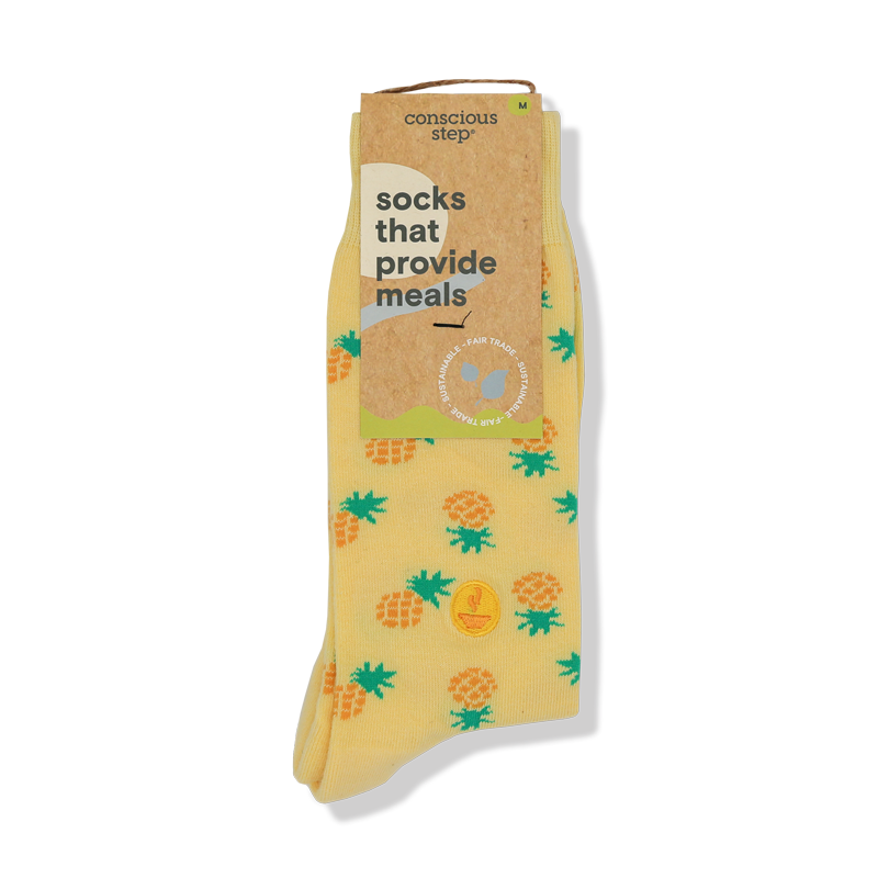 Feeling tropical? Slip-on our pineapple socks and transport yourself to warm weather and fruity cocktails. These bright yellow socks feature a fun pineapple pattern and bowl embroidery. Each pair helps feed people in need by supporting World Central Kitchen and their work, providing millions of people with food and resources during natural disasters and crises beyond.
